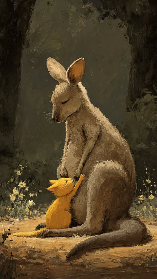 Bebé gatito fue muy protegido por la familia Canguro, ellos lo cuidaron y lo amaron cuando estaba desprotegido y solo.